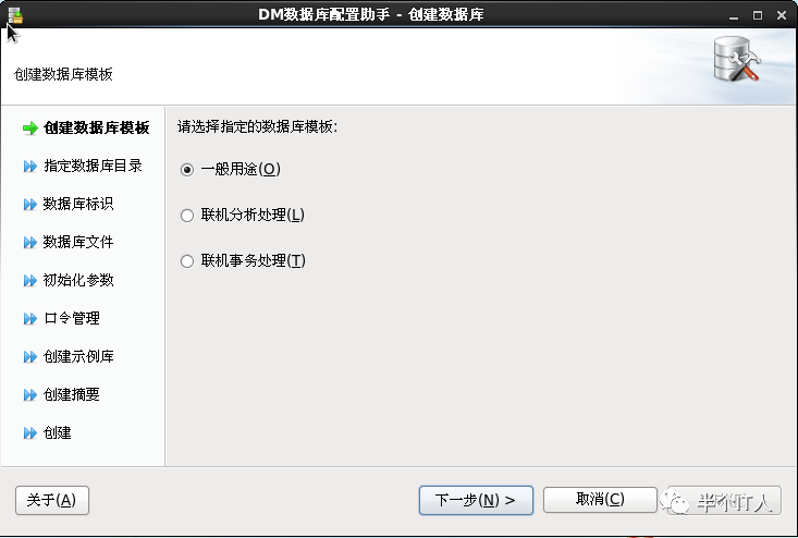 2)dbca.sh工具,在/usr/appsoft/dmdbms/tool 目录下,是一种图形化的界面。;我们这里选择图形化的方式创建。