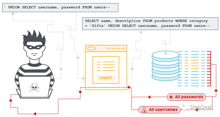 UNION 攻击,攻击者可以从不同的数据库表中获取数据。