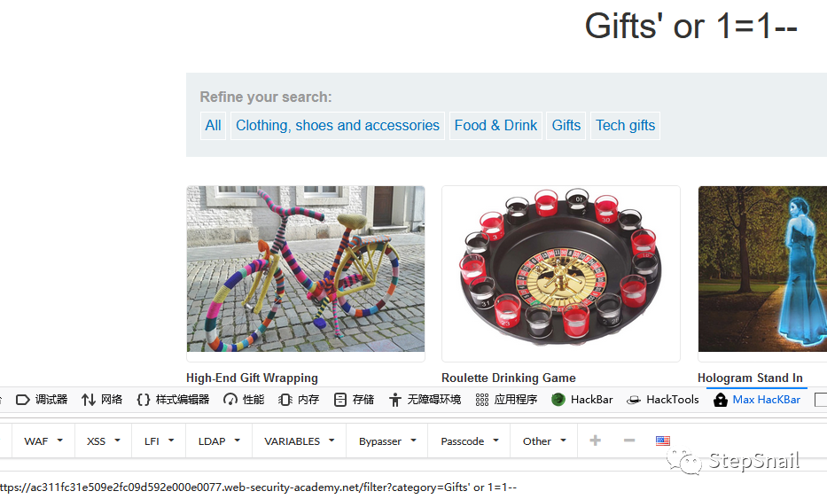更进一步,攻击者可以使应用程序显示任何类别中的所有产品,包括他们不知道的类别:https://insecure-website.com/products?category=Gifts'+OR+1=1--