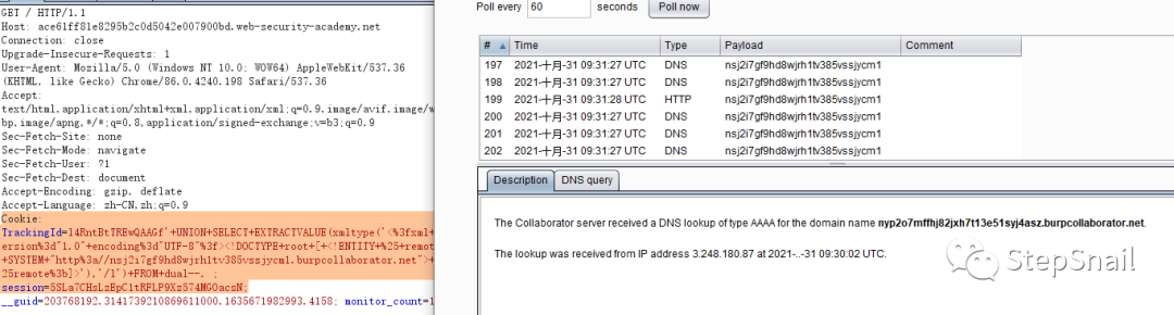 可以使数据库执行DNS查询到包含注入查询结果的外部域。为此,需要使用Burp Collaborator客户端生成将在攻击中使用的唯一Burp Collaborator子域,然后调用Collaborator Server以获取任何DNS交互的详细信息,包括exfiltrated数据。