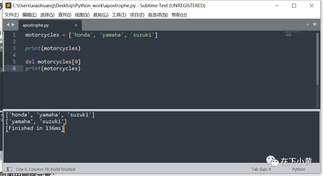 方法pop()有什么用处呢?假设列表中的摩托车是按购买时间存储的,就可使用方法pop()打印一条消息,指出最后购买的是哪款摩托车: