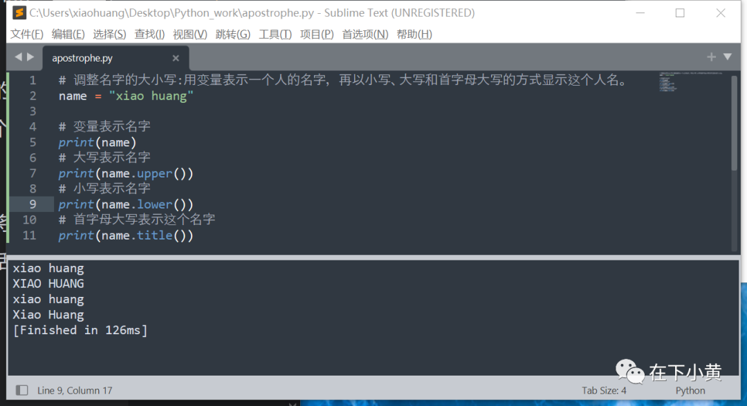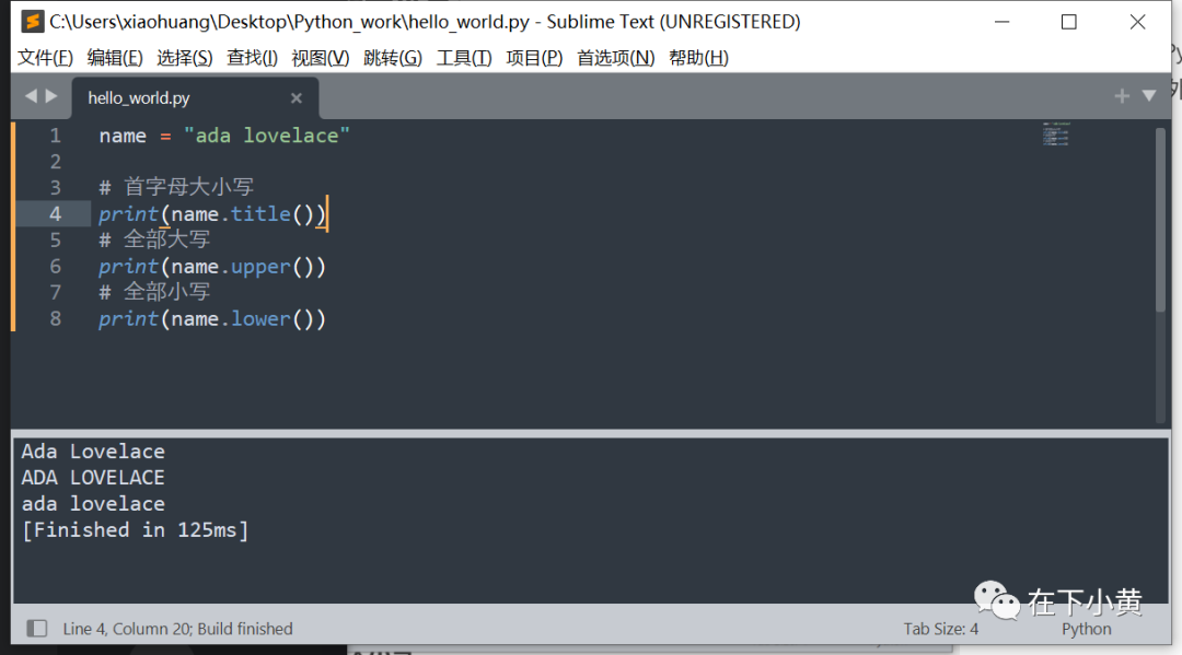 变量name指向小写的字符串"ada lovelace"。在函数调用print()中,方法title()出现在这个变量的后面。方法是Python可对数据执行的操作。在name.title()中,name后面的句点(.)让Python对变量name执行方法title()指定的操作。每个方法后面都跟着一对圆括号,这是因为方法通常需要额外的信息来完成其工作。这种信息是在圆括号内提供的。函数title()不需要额外的信息,因此它后面的圆括号是空的