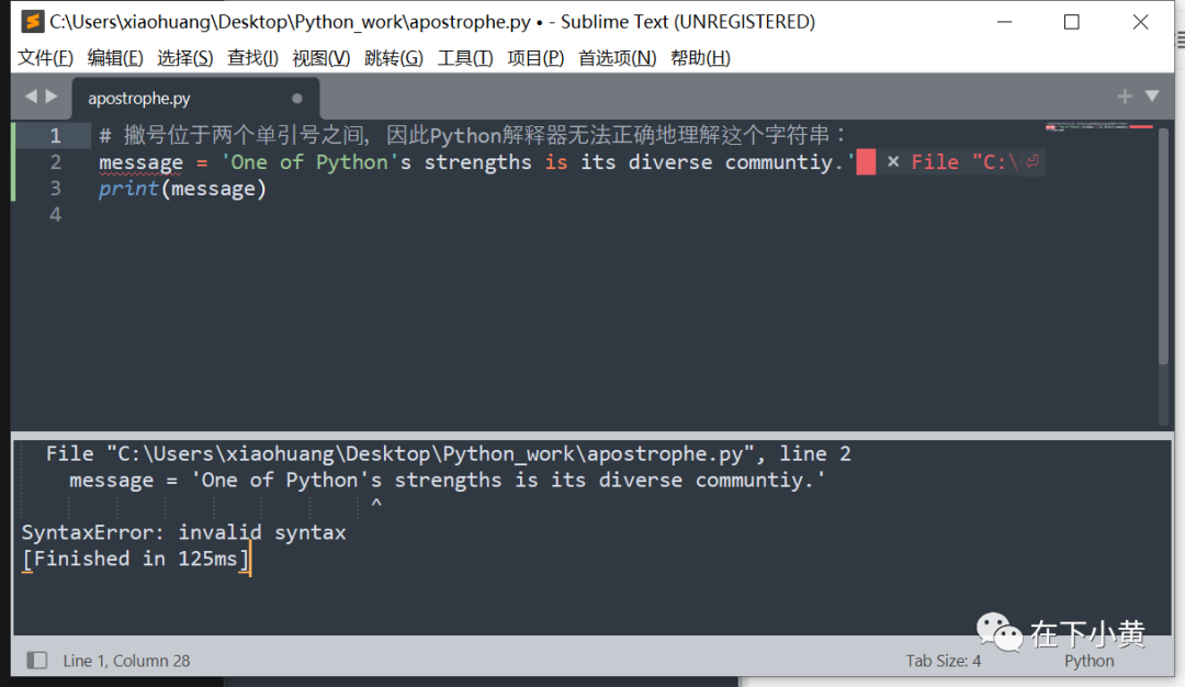 语法错误是一种你时不时会遇到的错误。 程序中包含非法的Python代码时,就会导致语法错误。 例如,在用单引号括起的字符串中,如果包含撇号,就将导致错误。 这是因为这会导致Python将第一个单引号和撇号之间的内容视为一个字符串,进而将余下的文本视为Python代码,从而引发错误。