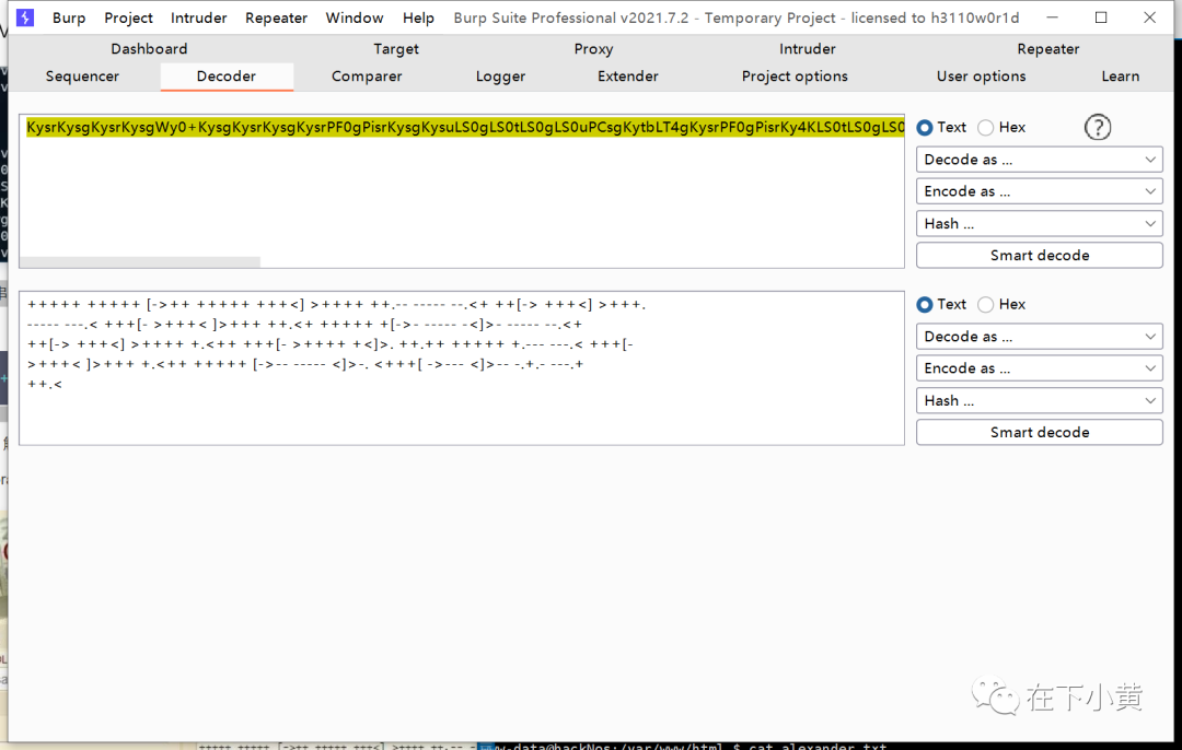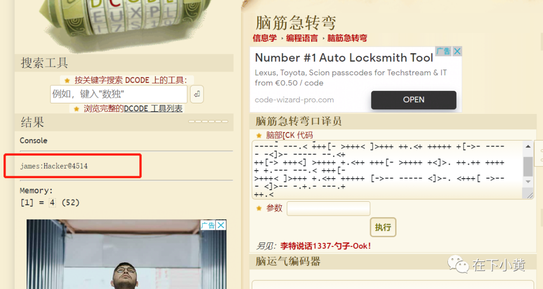 解密结果很明显又使用了别的加密方式,网上查找资料后发现为Brainfuck加密,使用Brainfuck解码 解码之后得到:james:Hacker4514