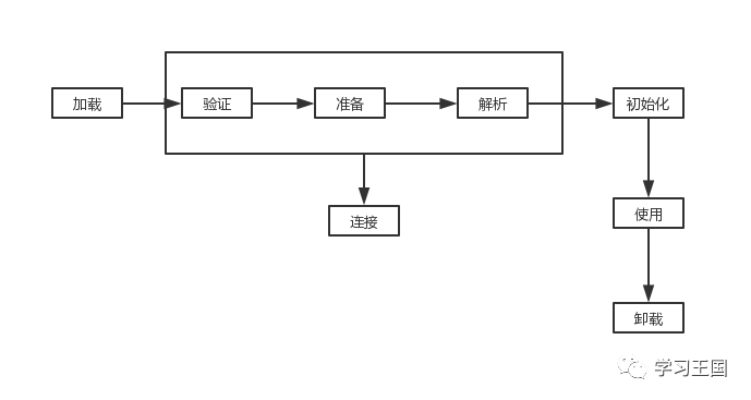 我们都知道java文件需要编译成class字节码文件才能被jvm加载执行,这里我们顺便说一下jvm加载一个class类的流程,如图: