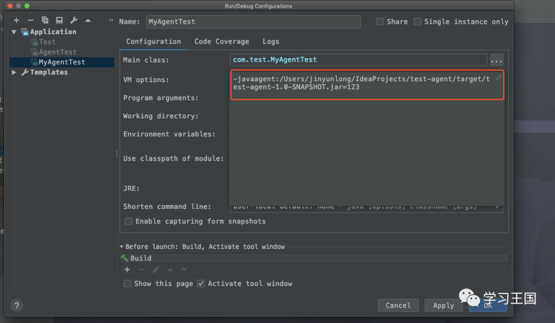 参数内容:-javaagent:/Users/jinyunlong/IdeaProjects/test-agent/target/test-agent-1.0-SNAPSHOT.jar=123