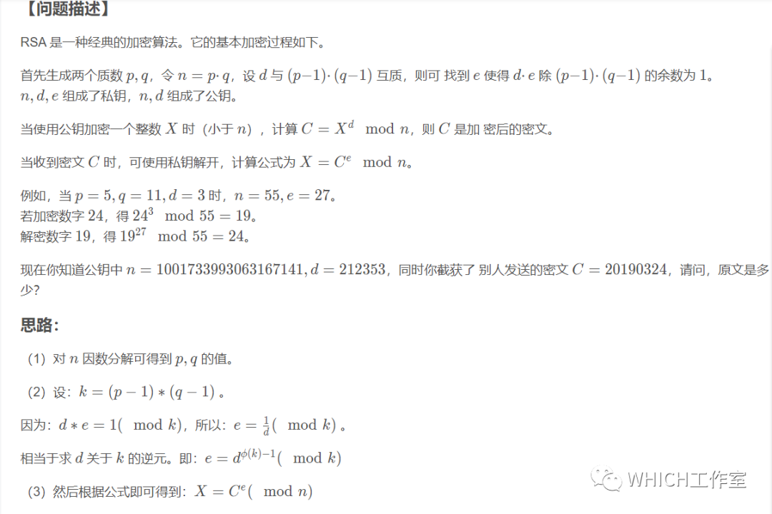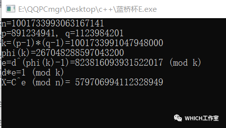 #include<bits/stdc++.h>using namespace std;typedef long long ;qq fast_mul(qq x, qq y, qq p){qq ret=0;x%=p, y%=p;while(y>0){if(y&1){ret= (ret+x)%p;}y>>=1;x= (x+x)%p;}return ret;}qq fast_pow(qq x, qq k, qq p){qq ret=1;x%=p;while(k>0){if(k&1){ret= fast_mul(ret, x, p);}k>>=1;x= fast_mul(x, x, p);}return ret;}qq phi(qq n){qq ret= n;for(int i=2;i*i<=n;i++){if(n%i==0){ret= ret/i*(i-1);while(n%i==0) n/=i;}}if(n!=1){ret= ret/n*(n-1);}return ret;}qq get_p(qq n){for(qq i=2;i<=n;i++){if(n%i==0){return i;}}}int main(){qq n = (qq)1001733993063167141;qq d = 212353;qq C = 20190324;qq p,q,e,k;printf("n=%lld\n",n);p=get_p(n);q=n/p;printf("p=%lld, q=%lld\n",p,q);k=(p-1)*(q-1);printf("k=(p-1)*(q-1)=%lld\n",k);printf("phi(k)=%lld\n",phi(k));e=fast_pow(d,phi(k)-1,k);printf("e=d^(phi(k)-1)=%lld (mod k)\n",e);printf("d*e=%lld (mod k)\n",fast_mul(d,e,k));qq X=fast_pow(C,e,n);printf("X=C^e (mod n)= %lld\n",X);while(1)getchar();return 0;}
