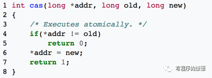 第一个参数的值和第二个参数不相等则返回 0 表示操作失败否则更新为新的值。这个函数不是由代码实现的而是 CPU 提供的一个指令,比如 Intel 的叫 cmpxchg;高级语言进行了封装,比如 Java 的 Atomic 变量。