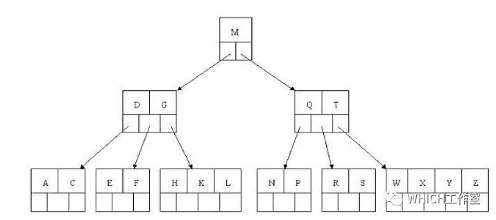 (1)获取根节点的关键字进行比较,当前根节点关键字为M,E<M(26个字母顺序),所以往找到指向左边的子节点(二分法规则,左小右大,左边放小于当前节点值的子节点、右边放大于当前节点值的子节点);