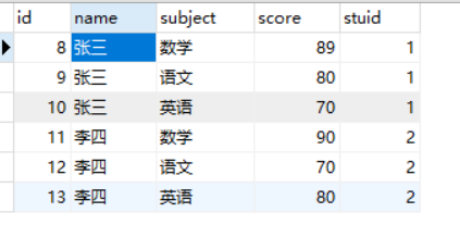 SELECT s.name,s.subject,s.score,s.stuid from student s,