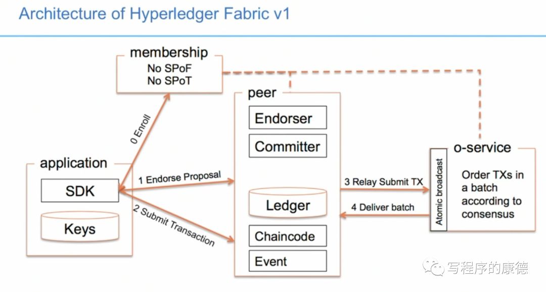 上图中的Applicaiton是基于Fabric的应用程序,membership是一个抽象组件,它还有个更常见的名字叫Membership Service Providers(MSP),它主要完成用户身份管理与认证(MSP没有权限管理,仅做认证)。在图中它和orderer、peer之间是虚线连接表示运行时在同一个进程。