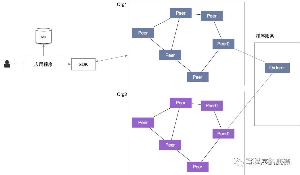 一般一个区块链会有多个“涉众”,在Fabric中称为“组织”。比如商品溯源,里面涉及到生产厂家和销售商家两个组织,那么他们就可以共同组成一个区块链。