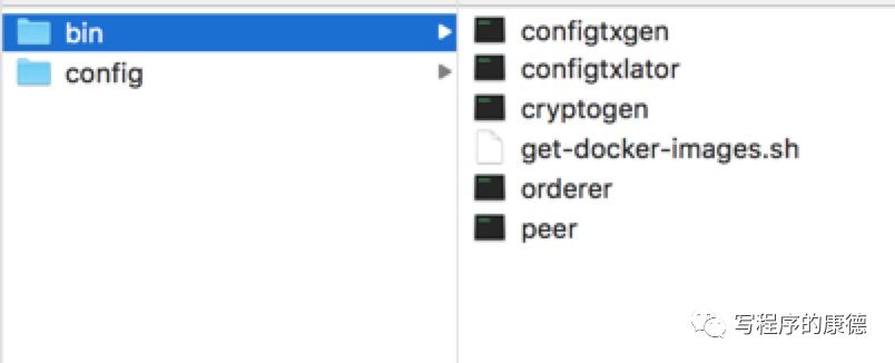 下载解压后在bin文件夹中包含了Fabric的所有二进制文件,除了我们后面需要的cryptogen、configtxgen还有orderer、peer,这两个就是orderer节点和peer节点进程的二进制文件。除非我们不在Docker上部署Fabric否则不需要这两个二进制文件。