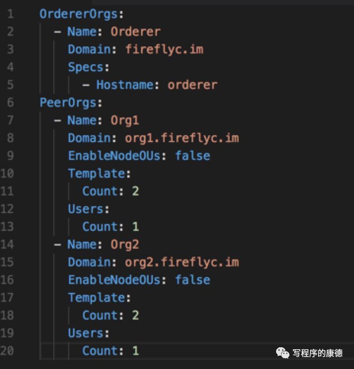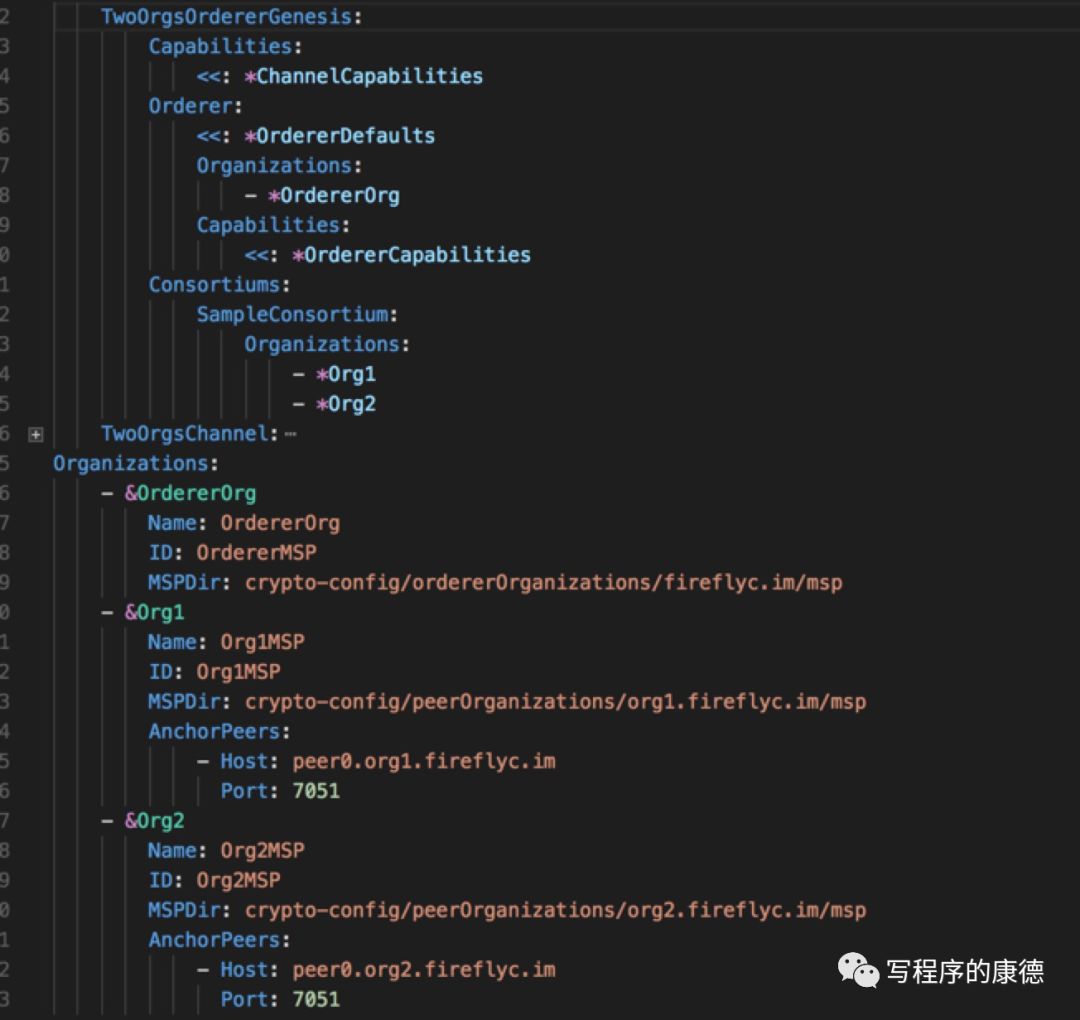 这里用到了YAML中不常见的一个语法——结点引用,比如配置中的*Org1是对后续定义的&Org1的引用。