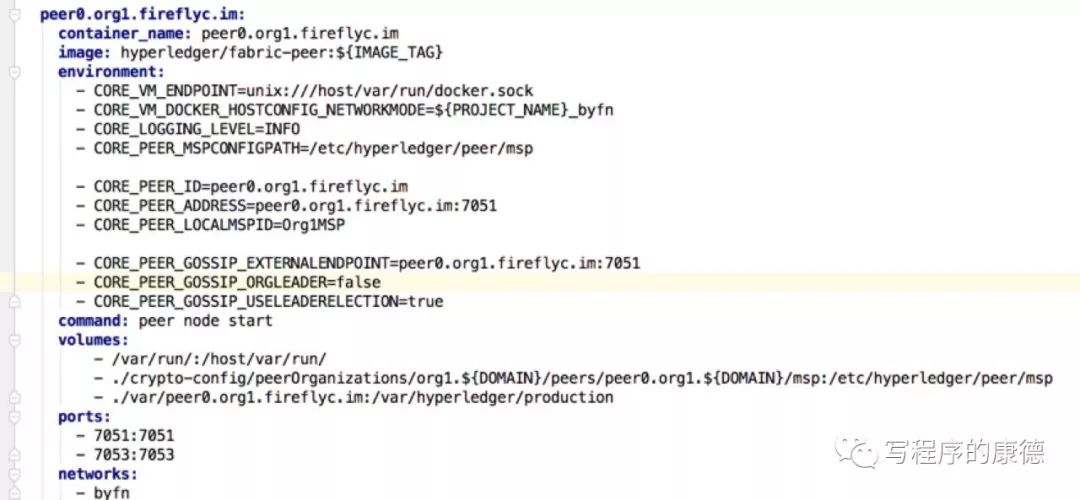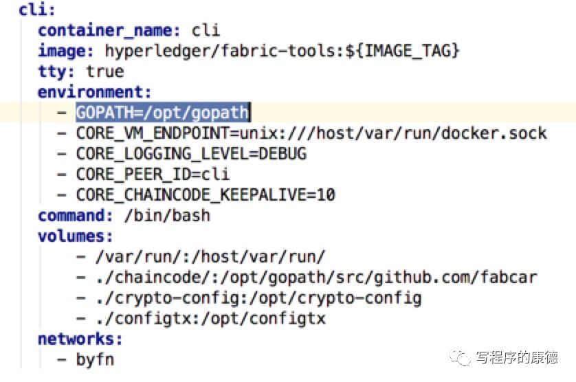 Peer节点要运行ChainCode,在Fabric中是通过Docker作为“虚拟机”来运行ChainCode的,所以我们必须把Docker的sock文件导入到Peer中。运行成功后的ChainCode会和Peer通讯所以要保证它们用同一个网络,通过CORE_VM_DOCKER\_HOSTCONFIG_NETWORKMODE