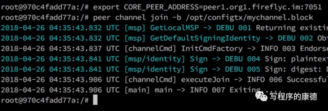 加入成功后可以在peer0.org1.fireflyc.im的日志中看到如下输出。