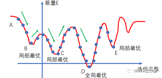 模拟退火算法来源于固体退火原理,在数学建模中经常用到,其基本原理将固体加温至充分高,再让其徐徐冷却,加温时,固体内部粒子随温升变为无序状,内能增大,而徐徐冷却时粒子渐趋有序,在每个温度都达到平衡态,最后在常温时达到基态,内能减为最小。根据Metropolis准则,粒子在温度T时趋于平衡的概率为e(-ΔE/(kT)),其中E为温度T时的内能,ΔE为其改变量,k为Boltzmann常数。用固体退火模拟组合优化问题,将内能E模拟为目标函数值f,温度T演化成控制参数t,即得到解组合优化问题的模拟退火算法:由初始解i和控制参数初值t开始,对当前解重复“产生新解→计算目标函数差→接受或舍弃”的迭代,并逐步衰减t值,算法终止时的当前解即为所得近似最优解,这是基于蒙特卡罗迭代求解法的一种启发式随机搜索过程。退火过程由冷却进度表(Cooling Schedule)控制,包括控制参数的初值t及其衰减因子Δt、每个t值时的迭代次数L和停止条件S。