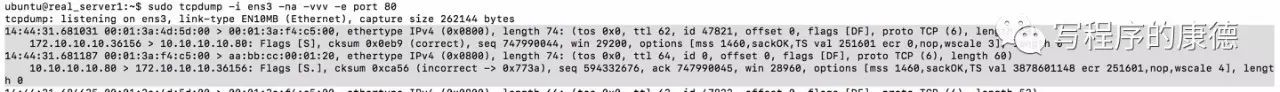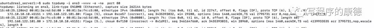 IP包处理模块修改数据包,把目标IP地址修改为192.168.122.101,从DIP的所在网卡发送出去(所以源MAC是DIP网卡的MAC)。此时的数据包是:源MAC地址变成了00:01:3a:4d:5d:00(DIP网卡的MAC地址)源IP地址是172.10.10.10(client的IP地址),目标MAC和目标IP地址是本机地址。通过在RS1上抓包验证这一点