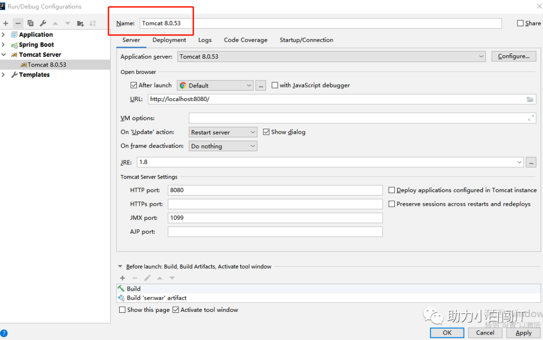 然后选择 Templates ---> Tomcat Server ---> Local;在右边框中啊Application server中点击Configure选择Tomcat安装路径