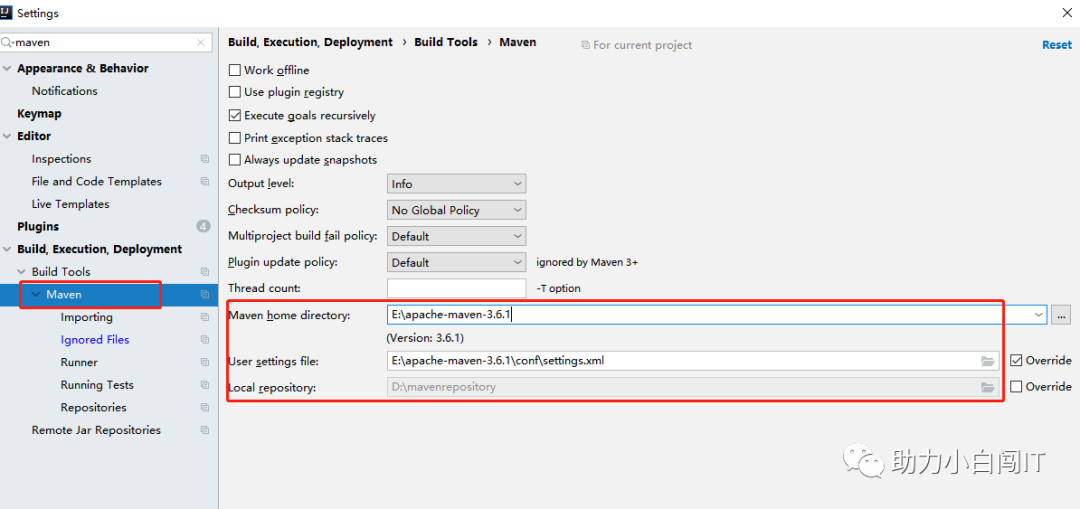 选择File ---> Settings ---> 找到Maven ---> 配置Maven Home Directory为我们maven的安装路径,User setting file配置为我们maven安装路线下的setting.xml文件,local repository配置为我们的本地仓库的路径