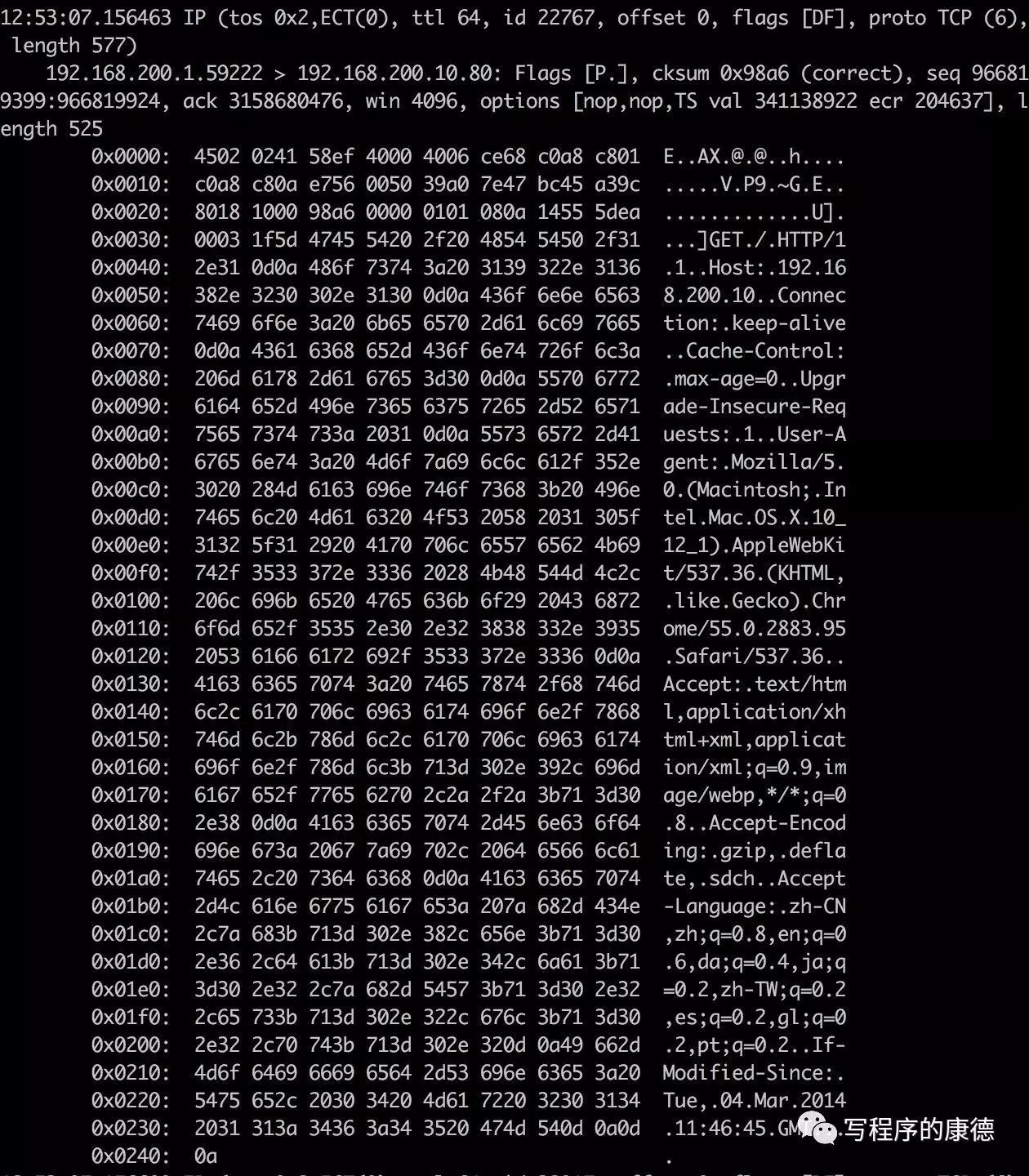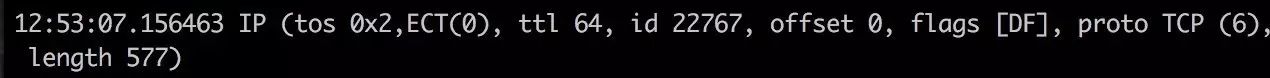 这是用tcpdump抓到的一个GET请求,第一行,12:53:07.156463 IP (tos 0x2,ECT(0), ttl 64, id 22767, offset 0, flags [DF], proto TCP (6), length 577)