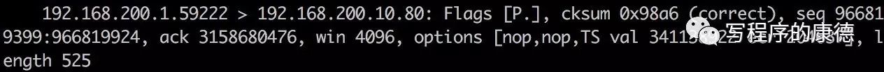 输出了当前时间(本机)、IP头部信息;第二行,192.168.200.1.59222 > 192.168.200.10.80: Flags [P.], cksum 0x98a6 (correct), seq 966819399:966819924, ack 3158680476, win 4096, options [nop,nop,TS val 341138922 ecr 204637], length 525