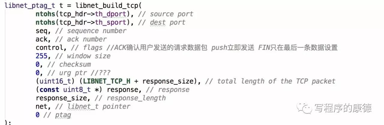 例子中0101没有意义,08表示这是时间戳选项(类型),后面0a是值所占字节(选项的整个长度,包括表示类型的1个字节表示长度的一个字节),1455 5dea(341138922) 四个字节表示发送端的时间戳,0003 1f5d(204637) 四个字节表示回显的时间戳。(对应tcpdump输出中的options [nop,nop,TS……])用一段代码表示如何构造TCP包
