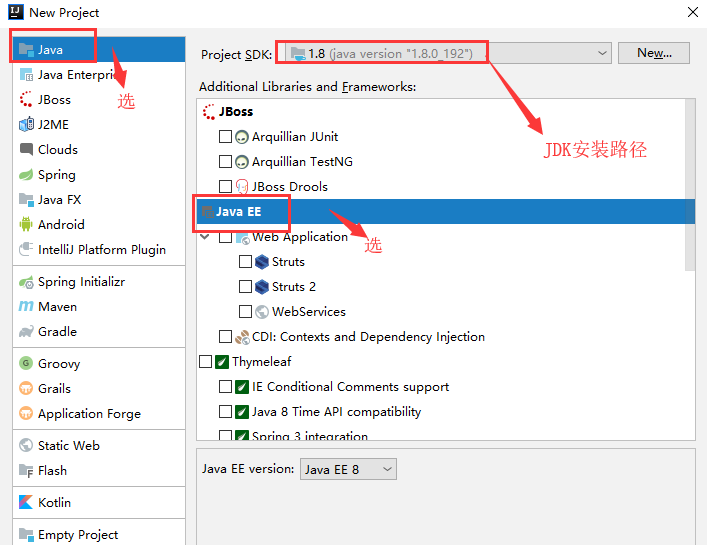 选择java并在旁边的列表中选择jdk版本以及java EE