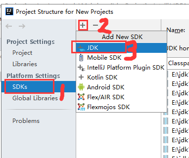 在顶部工具栏选择 File -> Other Settings -> Structure for New Projects(或者是Default Project Structure) -> SDK ->添加JDK
