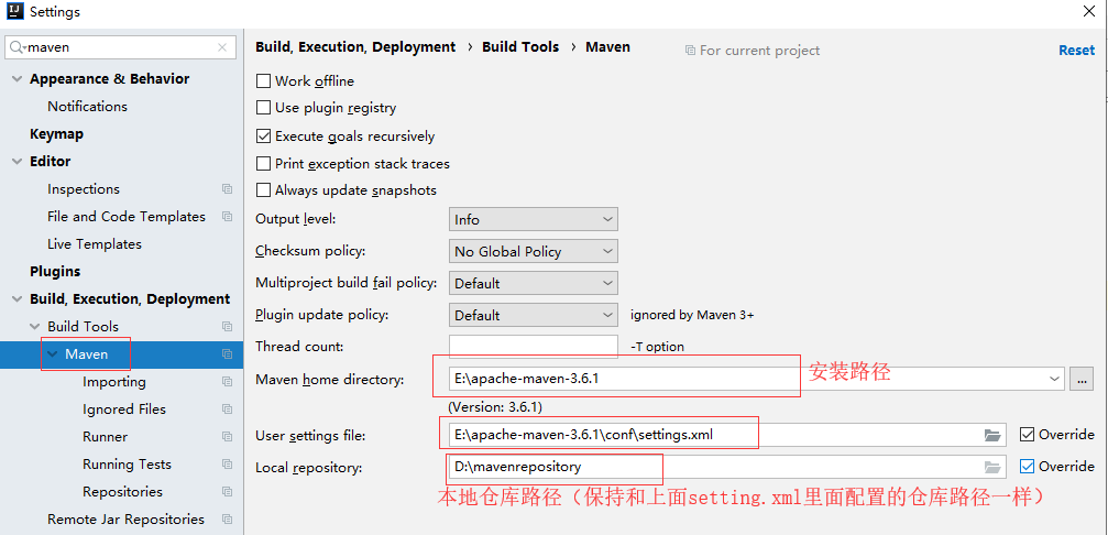 在顶部工具栏选择 File ->Settings ->搜索Maven -> 进行如下配置