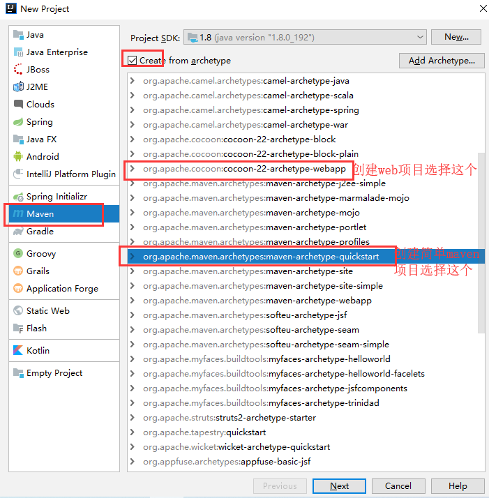 选择maven,勾选上Create from archetype,根据需要选择下面的任意一个