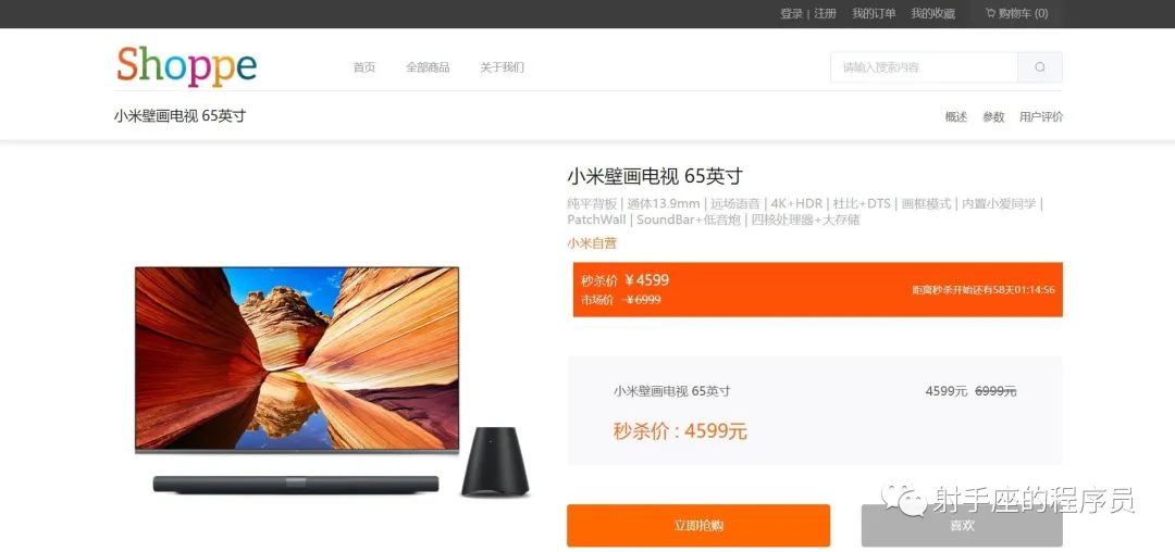 秒杀模块展示秒杀商品,秒杀商品有秒杀开始倒计时、秒杀中、秒杀结束三种状态,只有秒杀中用户才能抢购,并且直接生成订单且处于未付款状态。