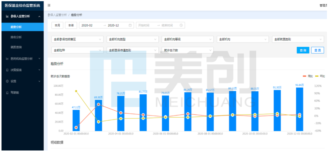 该平台以国家最新政策指标为依据,结合医保数据监管业务要求,对参保人员、定点医药机构等不同对象的各类信息进行多维度、全方位的数据分析和可视化展现,支持医保基金监管向精细化、高效能转变。
