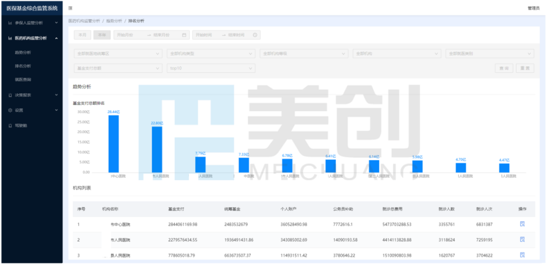 一方面可大幅简化管理者日常分析和汇报工作,提高工作效率和分析准确度,为医保规则、违规规则的制定与改进提供决策依据;另一方面可为医保局与医药机构的谈判、支付方式、支付标准和服务质量要求提供数据支持,辅助医保基金合理分配和管理,最终实现控制医保基金的不合理支出及不合理增长的目标。