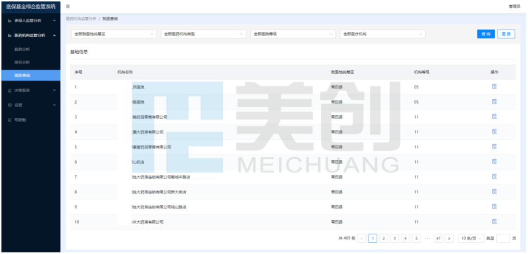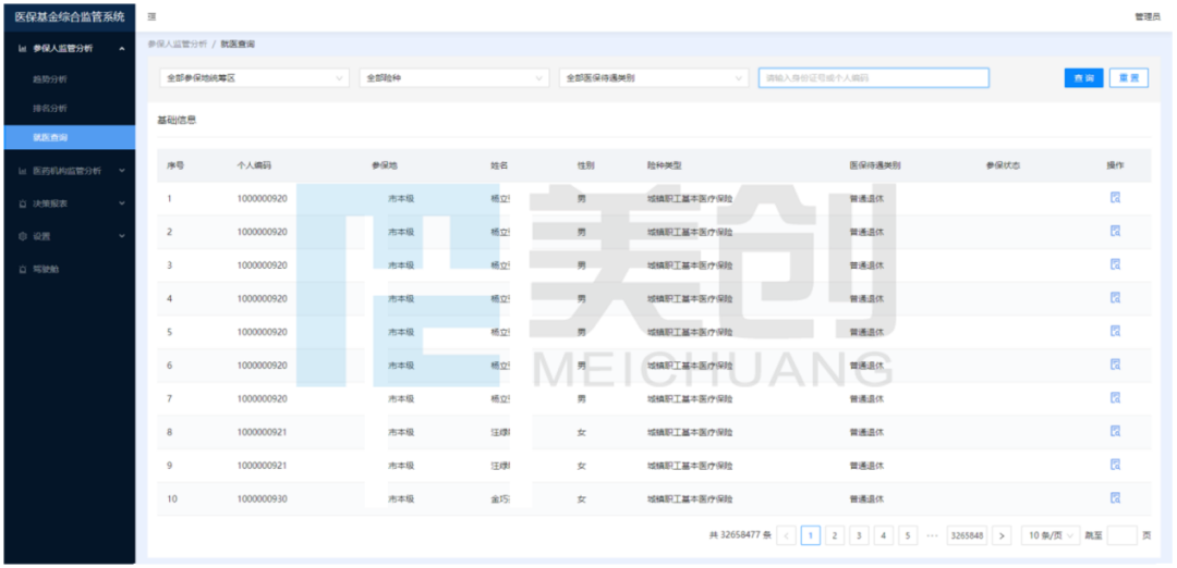目前,【美创医疗保障基金监管平台】已在全国近10 个省 市落地应用,为各省 市医保局提供医保监管大数据采集、存储、处理、分析和服务的整体解决方案。