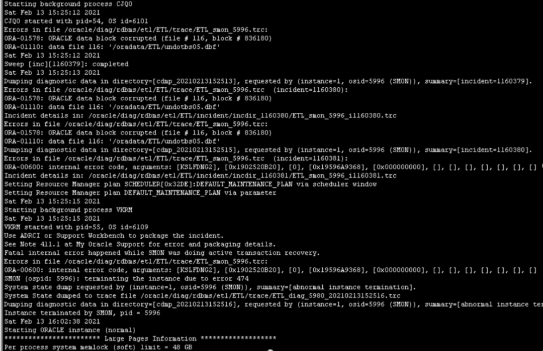 在这里给大家分享一个案例,从以下的日志可以看到Oracle data block corrupted(file#116,block#836180),这个输出的意思就是第116号数据文件的第836180块已经损坏了,通过视图查询得知,这个116号数据文件就是undo表空间。这时候的SMON进程为了保护数据的一致性,强制关闭了数据库,让我们无法打开数据库。