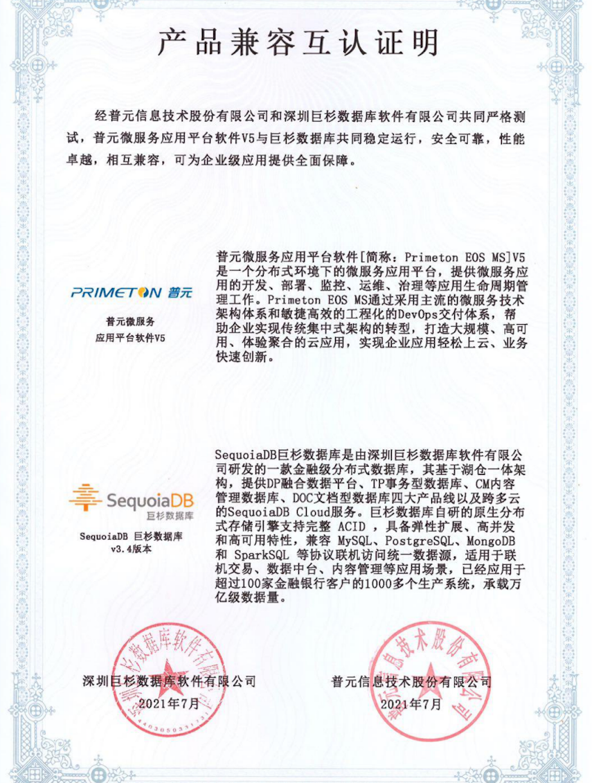 近期,深圳巨杉数据库软件有限公司与普元信息技术股份有限公司(以下简称普元信息)完成产品互认证工作,经过双方共同测试,巨杉数据库SequoiaDB V3.4与普元应用服务器软件V6.5、普元微服务应用平台软件V5能够共同稳定运行,可为企业级客户提供可靠稳定的数据库支撑,这也是巨杉数据库在国产生态适配中取得的又一重要成果。普元信息(股票代码:688118)创立于2003年,是国内专业的软件基础平台产品及解决方案提供商,目前公司拥有国家级企业技术中心、博士后科研工作站,是国家规划布局内重点软件企业。公司主要面向金融、电信、政务等行业的大中型企事业单位,为其提供创新可靠的软件基础平台产品(中间件、工具软件)及相关技术服务。普元信息作为信息技术应用创新生态链的重要成员,在金融信创业务场景的适配验证、技术攻关、标准制定及生态工作中发挥了积极作用。目前,普元在提供应用服务器、大文件传输平台、企业服务总线等信创产品的基础上,正在帮助多家金融机构进行OA系统、一般业务系统等应用系统的信创环境迁徙落地,通过业界领先的低代码开发能力,为用户提供从规划设计到适配集成,直至升级落地的全方位保障服务,能够满足多样性和个性化的金融信创选择。