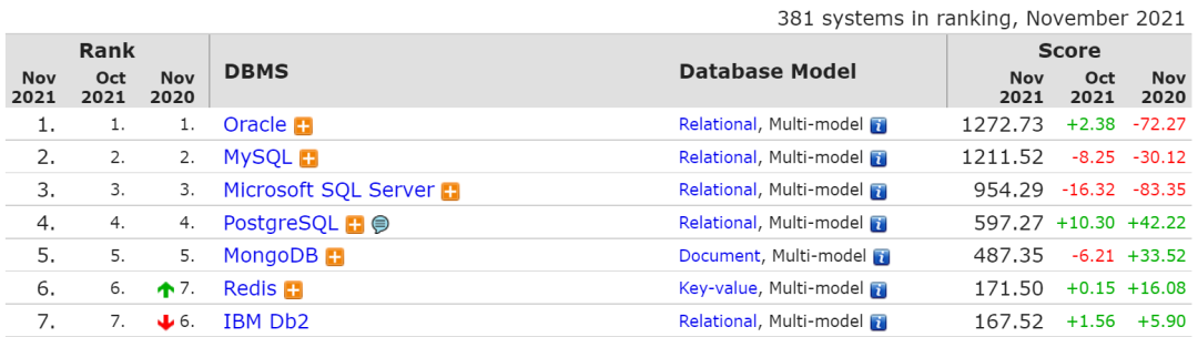 DB-Engines 2021年10月份统计,PostgreSQL当月上升10.30点,总分是597.27;SQLServer当月大幅下降16.32,总分是954.29 。按照这样的速度,2年之内,PostgreSQL即将超越SQLServer。