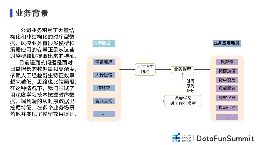 导读:随着公司业务的不断扩大,包括金融领域在内的各个领域中,逐渐积累了大量的时序数据,通过时序数据建立模型和制定策略能为业务提供有效地帮助。目前,在面对日益增长的数据量和复杂度,依靠人工衍生处理特征效率低,局限性大。因此采用深度学习挖掘时序数据特征,使得时序数据在多业务场景的应用中,带来对模型效果的明显提升。