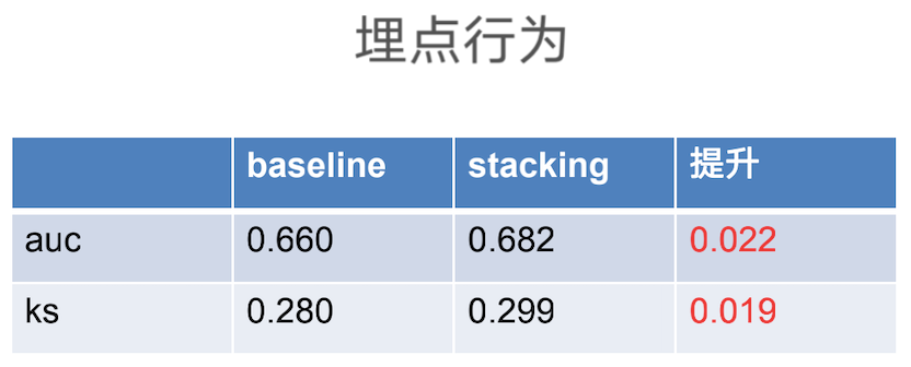 然后,用深度学习模型对同样的数据挖掘训练stacking模型,stacking模型是挑战者模型,除了baseline用到的特征,它还加入了时间序列模型的评分作为特征,在auc和ks上都有比较明显的改善,提现了时间序列模型的边际价值。