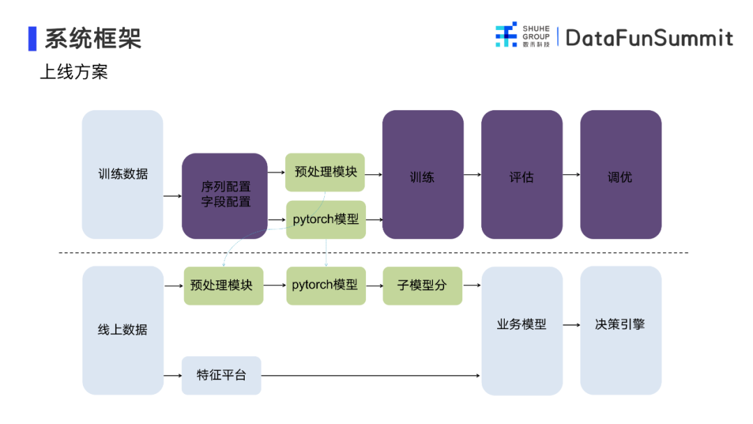 如上图所示,整个框架是分为模型训练以及业务真实上线两大部分。在训练部分,首先需要将整个时间序列数据的字段进行配置,配置后自动生成预处理模块,将原始表单数据转化为pytorch可以识别的tensor,pytorch模型会进一步训练、评估、调优。模型训练结束后,在训练部分的预处理模块和pytorch模型会直接嵌入到线上的系统中,换句话说,将预处理模块和pytorch模型处理线上数据生成子模型分,与之前特征平台的衍生特征进行融合,生产新的模型(任意业务模型),最后导入到决策引擎中。这种处理方式,不会破坏系统原有的结构。