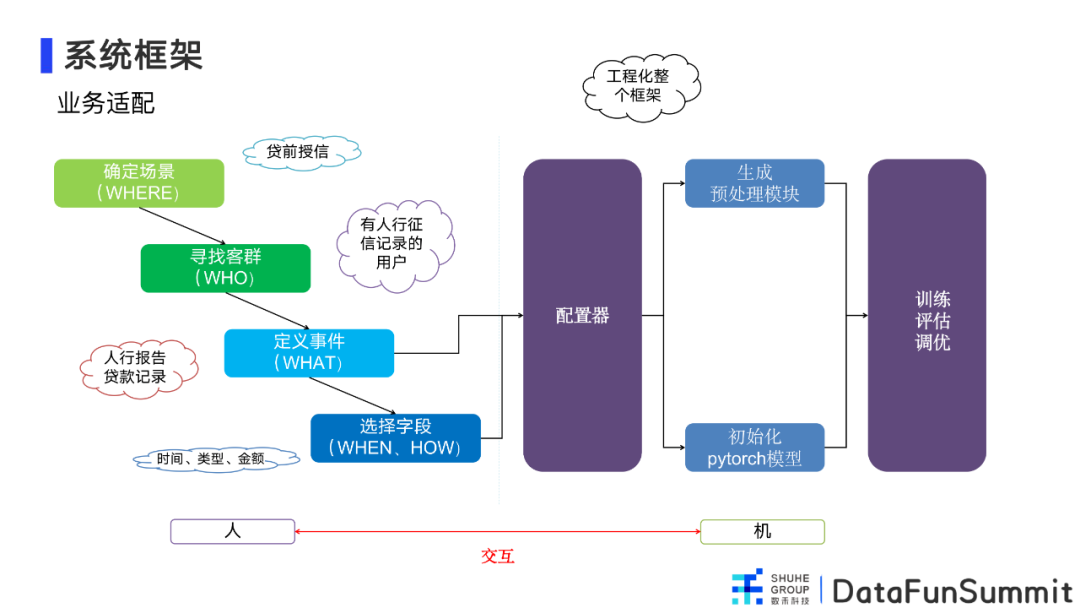 这套框架的建立之初,目的是实现更好的人机交互。如上图所示,首先需要人确定使用场景、寻找相应客群、定义事件、针对不同事件选择字段,将上述内容配置好以后传输到配置器模块,配置器模块生成一个预处理模块对表单数据进行预处理转化,最后将转换好的数据和模型一起进行训练、评估、调优。