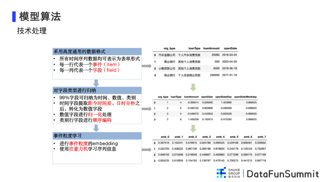 举个数据预处理的例子:上图中第一个表单是从人行报文中截取的一小段原始数据,每一行为一个事件(item),每一列是一个字段(field),是一个完整的时间行为序列表单。下一步,需要将表单归纳总结,进行标准化处理,将类别行变量映射到编码上,时间型变量进行时间间隔提取,时分秒的拆分以及标准化,数值型变量进行归一化处理。接下来将已经处理好的数据转化为tensor数据用模型编码器编码,即得出每个事件的编码,至此处理完成的数据供任何模型使用。