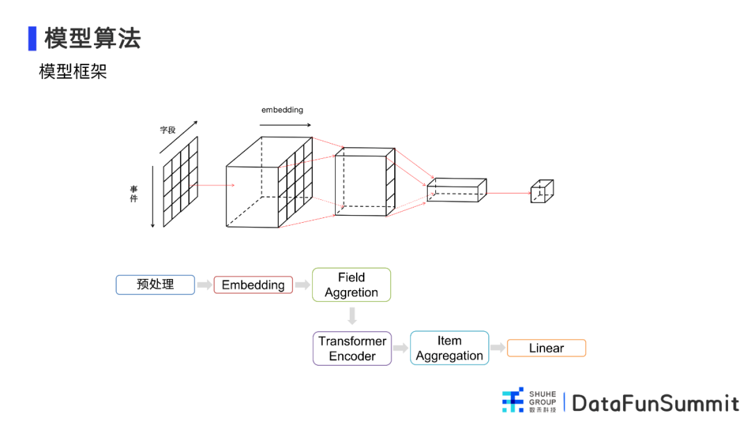 接下来介绍一下模型框架。举个例子:一个用户的原始数据是一个表单,将表单预处理为pytorch可以识别的tensor,纵向是事件,横向是字段,第一步,需要对数据的每一个格进行embedding,生成一个三维张量,进一步对张量进行压缩,压缩过程分为两步,首先使用Filed Aggregation对字段进行压缩,得到一个事件的单独向量,再使用Item Aggregation对时间维度进行压缩,最后将整个时间序列转成向量,最后用一个全连接层转化为模型的输出。