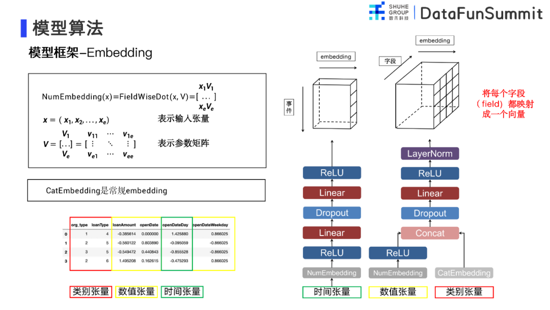下面具体介绍一下算法框架中的Embedding部分,第一步对类别型变量进行embedding,由于类别型张量每一值都为整数,因此,将每一个类别型代码都映射成一个向量;对于数字型张量,将每一个张量都单独形成一个向量;将类别型和数字型都转为向量后再连接起来,构成三维矩阵;时间张量进行单独处理,进行升维和linear处理之后,最后得到时间表征的矩阵。