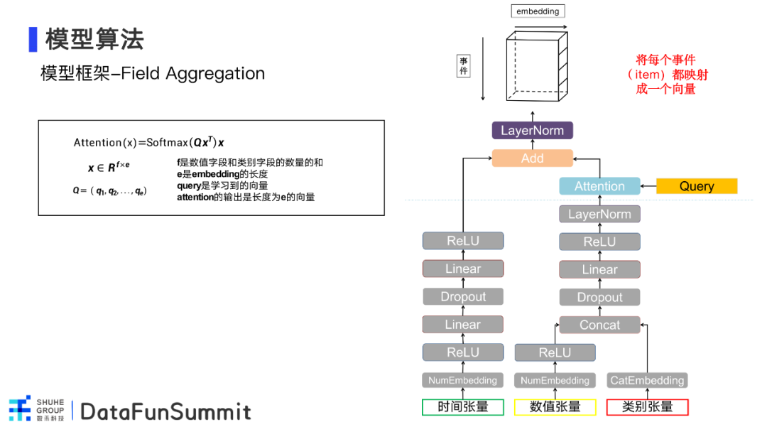 接下来具体介绍一下算法框架中的Filed Aggregation部分,该层为字段的加总。在上层的处理中, 类别型和数字型形成的三维张量通过attention和query的操作降维,形成一个矩阵,再与时间特征的矩阵相加得到一个新的矩阵,称为事件的矩阵。