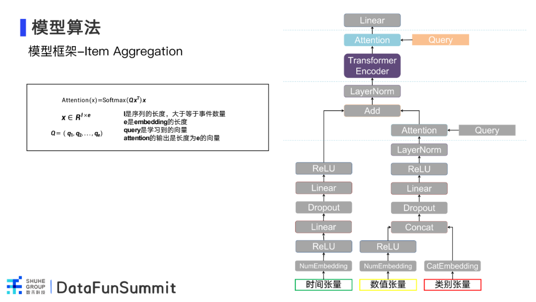 最后具体介绍一下算法框架中的Item Aggregation部分,将上一层处理得到的矩阵直接放入transformer encoder中进行提取,再使用一个attention和query的模式加总,得到每一个时间序列向量的表示,再加单个或多个的linear层输出模型。